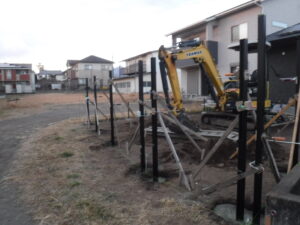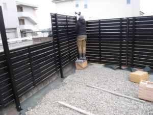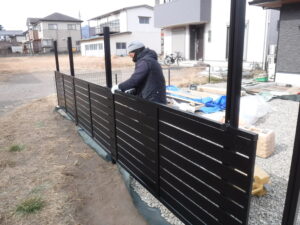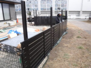 目隠しフェンス作業の様子です 独立基礎の多段柱仕様です