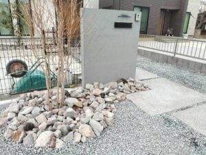 ドックランスペースを確保しました シンプルデザインな門柱と足元はロックガーデン風に