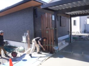 駐車場・門回り作業の様子です 建物と調和するブラックのカーポートと木目の門柱がデザインのポイントです
