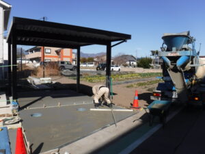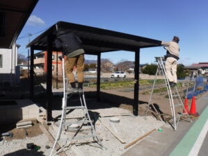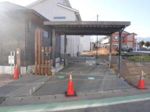 駐車場・門回り作業の様子です 建物と調和するブラックのカーポートと木目の門柱がデザインのポイントです